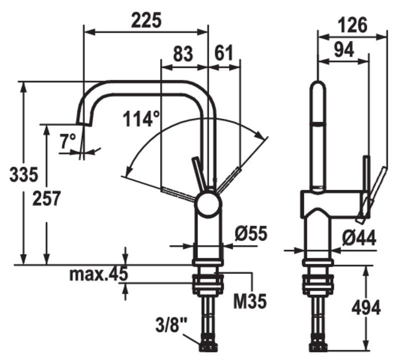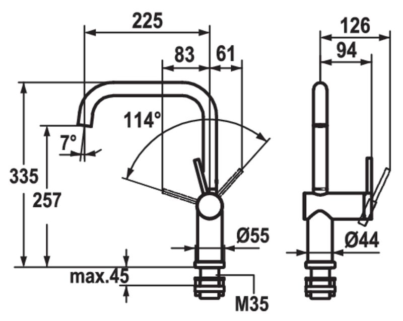Schwenkbereich 125° (Neoperl® Cascade®)