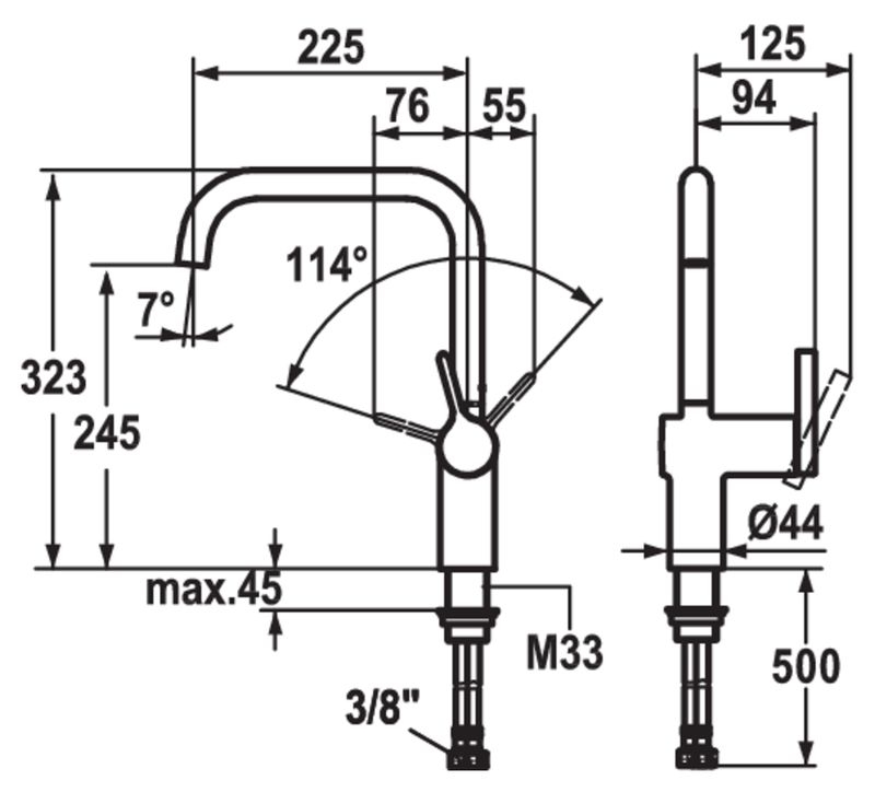 Einhebelmischer. Mit schwenkbarem Auslauf, seitlichem Hebel und Keramikkartusche.