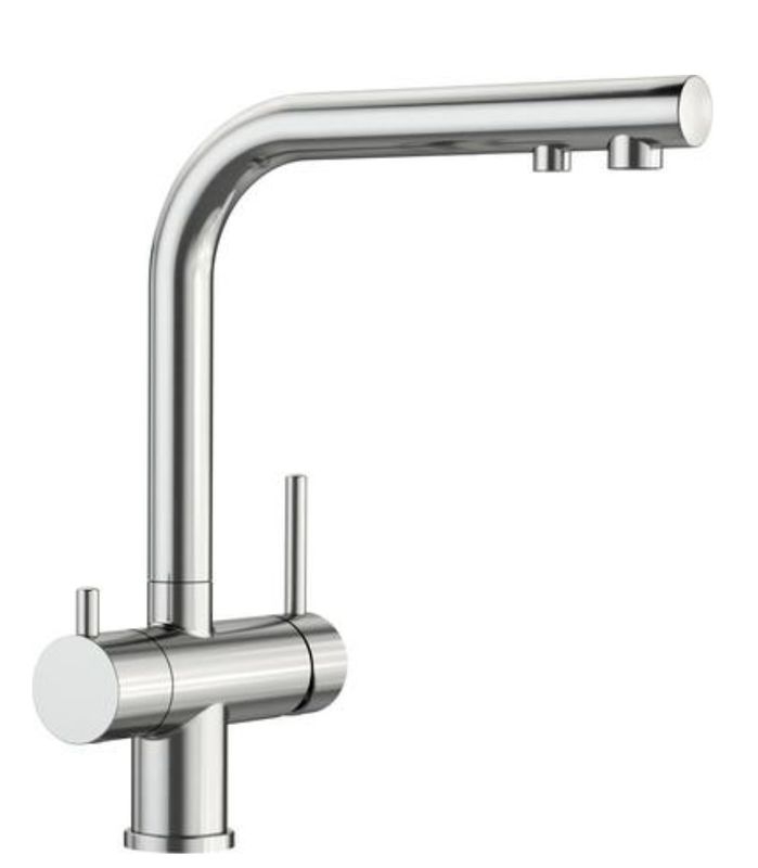 Komfortable 3-in-1-Armatur mit Mischhebel rechts für Kalt- und Warmwasser sowie Drehgriff links für gefiltertes Wasser