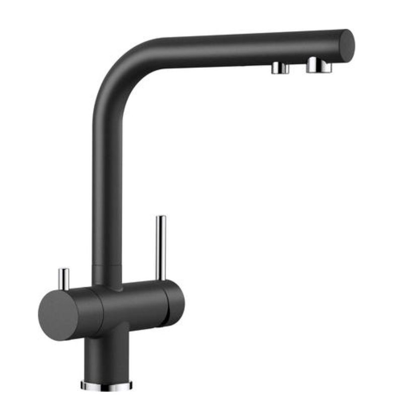 Komfortable 3-in-1-Armatur mit Mischhebel rechts für Kalt- und Warmwasser sowie Drehgriff links für gefiltertes Wasser