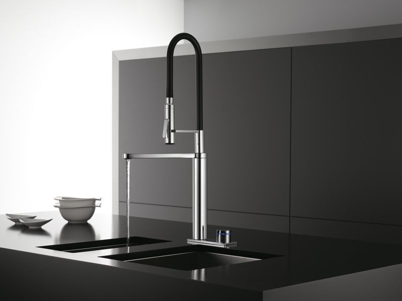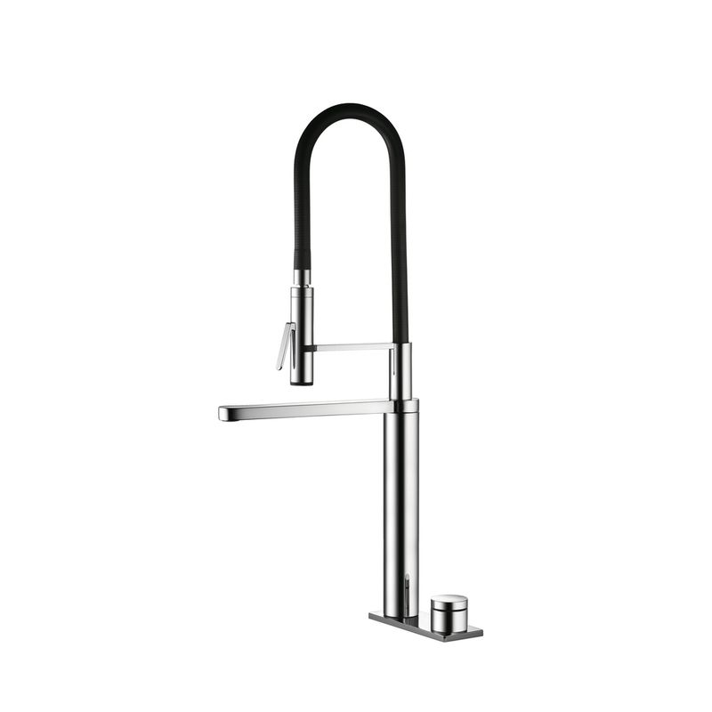 Einhebelmischer. Mit schwenkbarer Profibrause und High Flex patentierter Federschlauchtechnologie, seitlichem Hebel und Keramikkartusche.