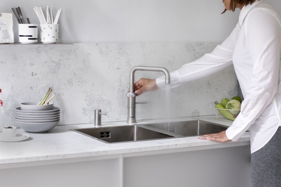Die neue Funktion bringt noch mehr Freude in die Küche. Sie spart Zeit und Raum, macht die Verwendung von Plastikflaschen überflüssig und ist völlig sicher. Um sprudelndes Wasser zu erhalten, drücken und drehen Sie den geriffelten Ring. Der Leuchtring, der bei kochendem Wasser rot wird, blinkt nun blau: Sprudelwasser ist im Anmarsch. Halten Sie den Knopf ein wenig länger, kommt stilles Wasser aus dem Wasserhahn und der Leuchtring färbt sich durchgängig blau. Es ist also nicht möglich, versehentlich kochendes Wasser zu zapfen, obwohl man eigentlich gekühltes Wasser entnehmen wollte.