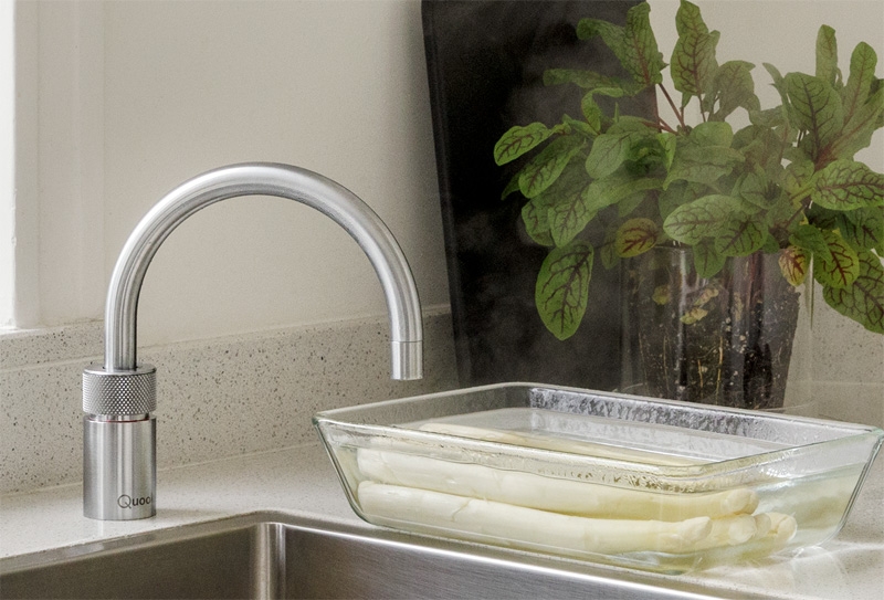 Der Quooker stellt sofort kochendes Wasser bereit. Der Hahn ist fest auf der Arbeitsfläche installiert und das Reservoir passt bequem unter das Spülbecken. Die Anwendungsmöglichkeiten des Quookers sind vielfältig – für Tee, Kaffee, zum Kochen von Kartoffeln, Reis, Nudeln, Gemüse und vieles mehr. Jederzeit im Handumdrehen kochendes Wasser. Sicher, Energie-effizient, multifunktional einsetzbar und erhältlich in acht Hahnmodellen und drei Oberflächen. Sofort kochendes Wasser – jederzeit.