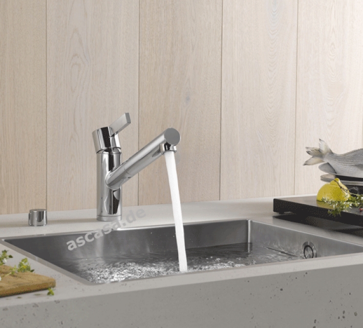 Neben der klassischen Einhebelmischer-Variante gibt es die Armatur Eno auch als Pullout-Armatur. Der Pull-out Wasserhahn Dornbracht Eno zeichnet sich durch das nach vorne herausziehbare Funktionselement aus und ist wahlweise mit einem herausziehbaren Auslauf oder einer herausziehbaren Brause erhältlich.