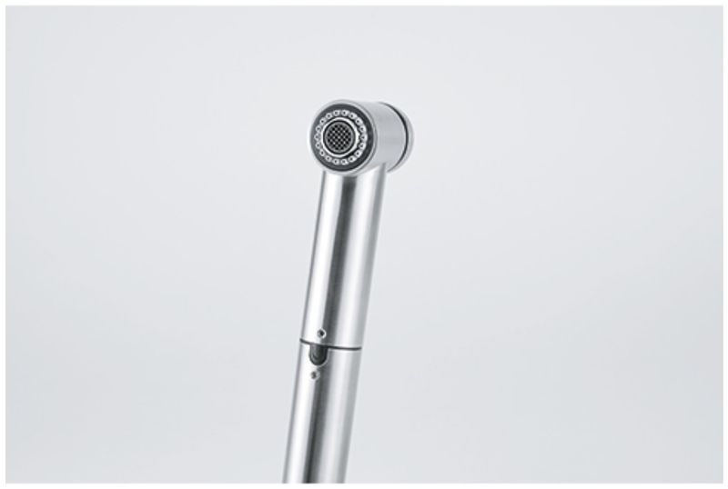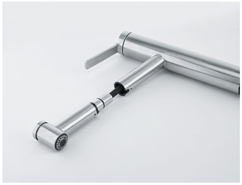 Massiv-Edelstahl Armatur mit geradlinigem Design und Auszugsbrause in hochwertiger Metallausführung