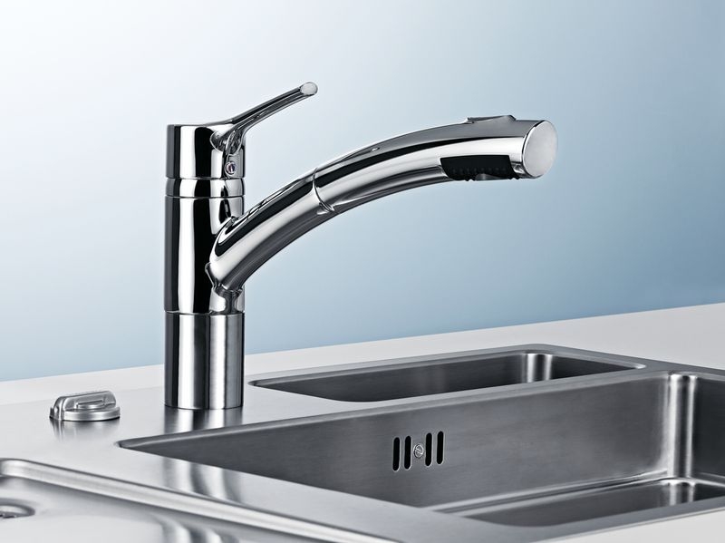 • Einhebelmischer. Mit schwenk-/herausziehbarer Schlauchbrause (Strahl/Brause umstellbar) und Keramikkartusche.