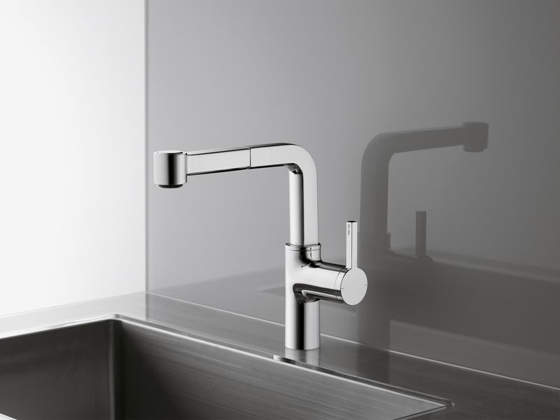 Einhebelmischer. Mit schwenk-/herausziehbarer Schlauchbrause (Strahl/Brause umstellbar), seitlichem Hebel und Keramikkartusche.