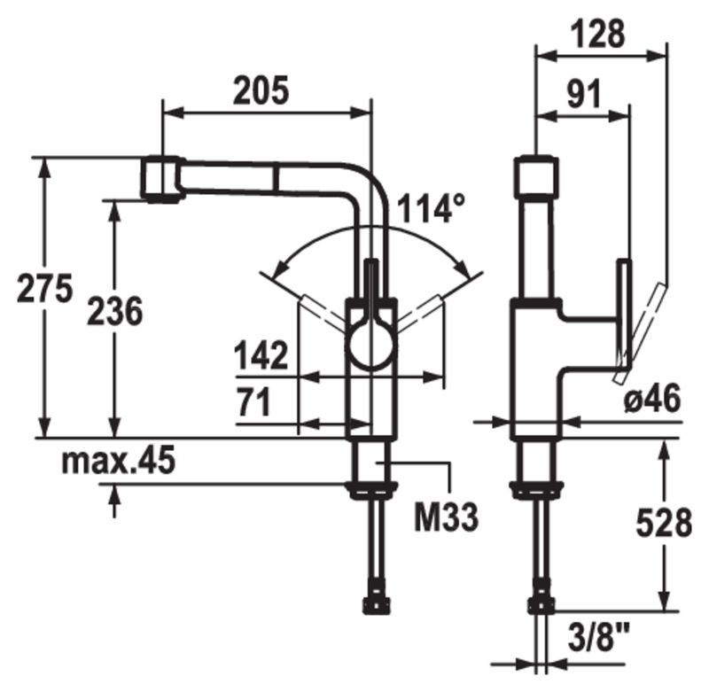 Einhebelmischer. Mit schwenk-/herausziehbarer Schlauchbrause (Strahl/Brause umstellbar), seitlichem Hebel und Keramikkartusche.