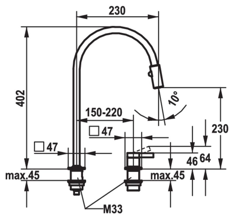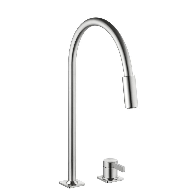Zweiloch-Einhebelmischer. Mit hohem Schwenkauslauf und ausziehbarer Umstellbrause, separat zu positionierendem Hebel und Keramikkartusche.