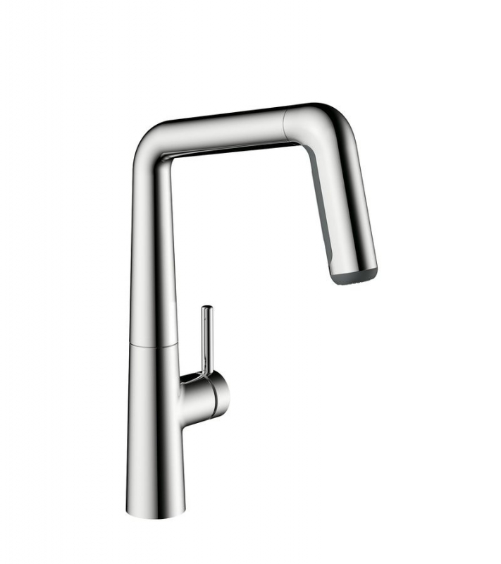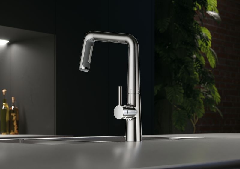 Einhebelmischer. Mit schwenk-/herausziehbarer Schlauchbrause (Strahl/Brause umstellbar), seitlichem Hebel und Keramikkartusche. Inkl. Laminarstrahlregler.