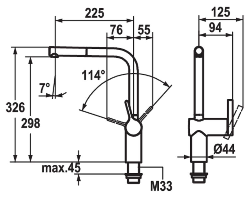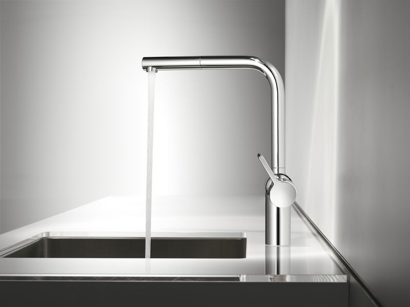 Einhebelmischer. Mit schwenk-/herausziehbarem Auslauf, seitlichem Hebel und Keramikkartusche.