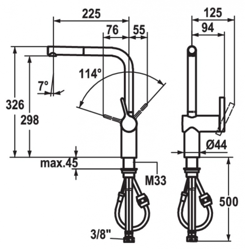 Einhebelmischer. Mit schwenk-/herausziehbarem Auslauf, seitlichem Hebel und Keramikkartusche.