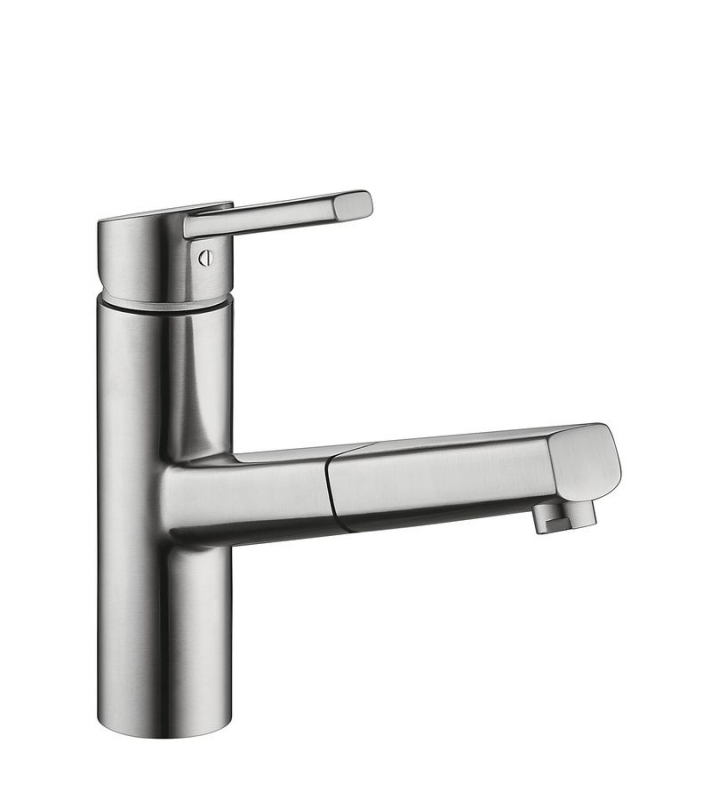 Einhebelmischer. Mit schwenk-/herausziehbarem Auslauf (aus Metall) und Keramikkartusche.