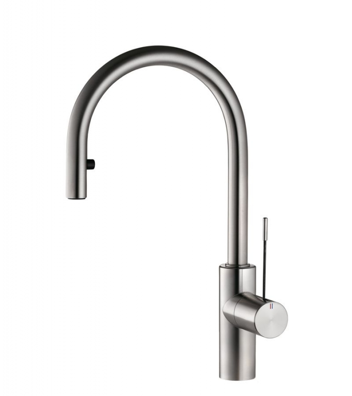 Einhebelmischer. Mit schwenk-/herausziehbarem Auslauf, seitlichem Hebel und Keramikkartusche.