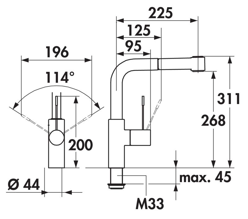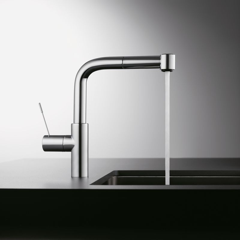 Einhebelmischer. Mit schwenk-/herausziehbarer Schlauchbrause (Strahl/Brause umstellbar), seitlichem Hebel und Keramikkartusche.