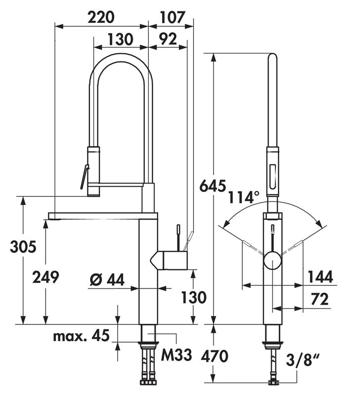 Einhebelmischer. Mit schwenkbarem Auslauf und federgeführter Schlauchbrause, seitlichem Hebel und Keramikkartusche.