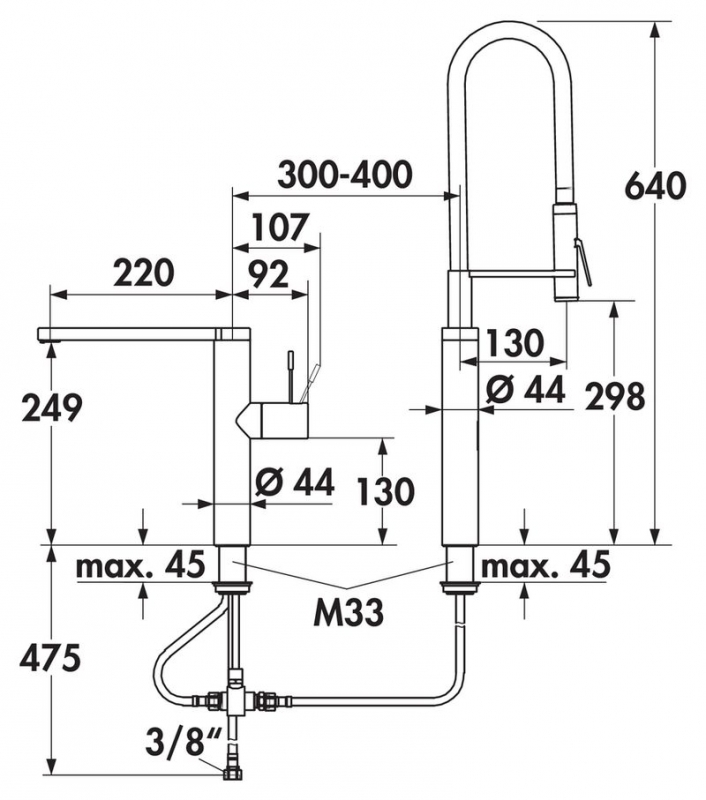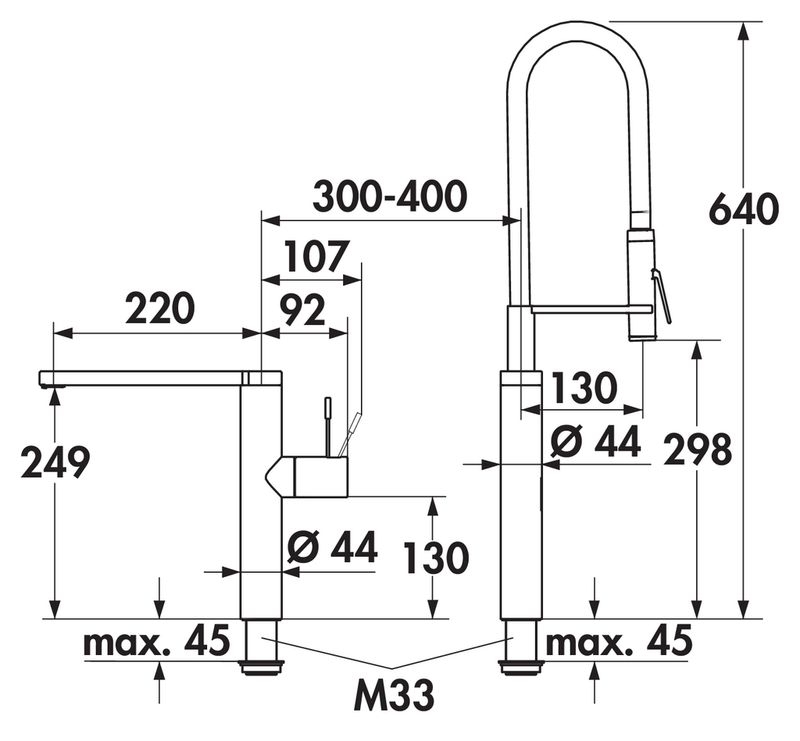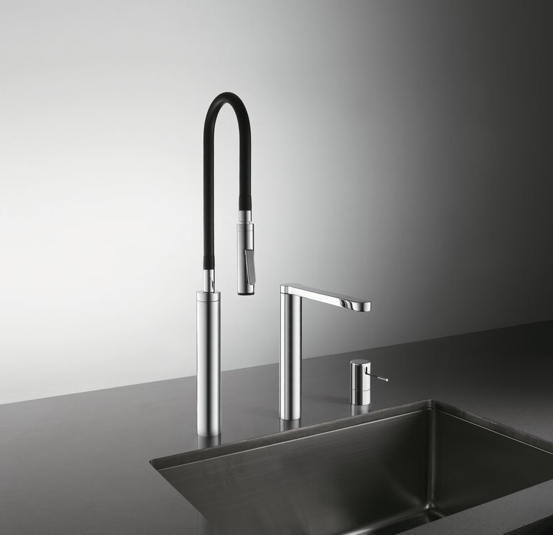 Zweiloch-Einhebelmischer. Mit schwenkbarem Auslauf, federgeführter Schlauchbrause und Keramikkartusche.