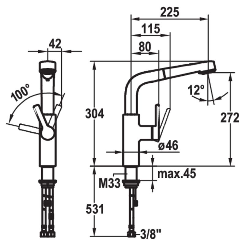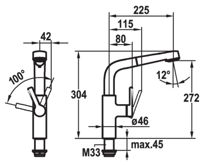 Einhebelmischer. Mit schwenk-/herausziehbarer Schlauchbrause (Strahl/Brause umstellbar), seitlichem Hebel und Keramikkartusche.
