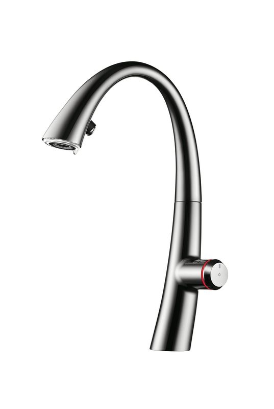 Premium-Lifestyle Armatur mit scheinbar unsichtbar in den Auszugauslauf integriertem LED-Lichtring, inkl. integriertem On-/Off-Taster mit Abschaltautomatik nach 30 Minuten