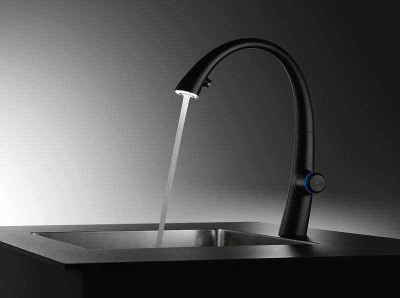 Premium-Lifestyle Armatur mit scheinbar unsichtbar in den Auszugauslauf integriertem LED-Lichtring, inkl. integriertem On-/Off-Taster mit Abschaltautomatik nach 30 Minuten