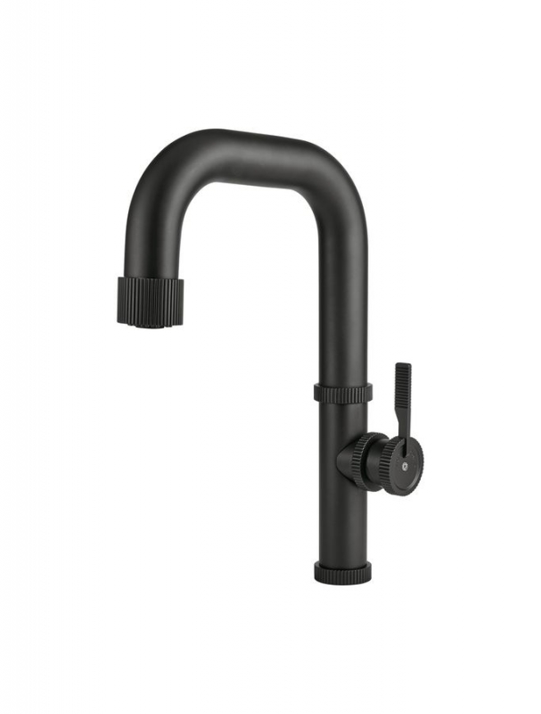 Einhebelmischer. Mit schwenk-/herausziehbarer Schlauchbrause aus Metall (Strahl/Brause umstellbar), seitlichem Hebel und Keramikkartusche.