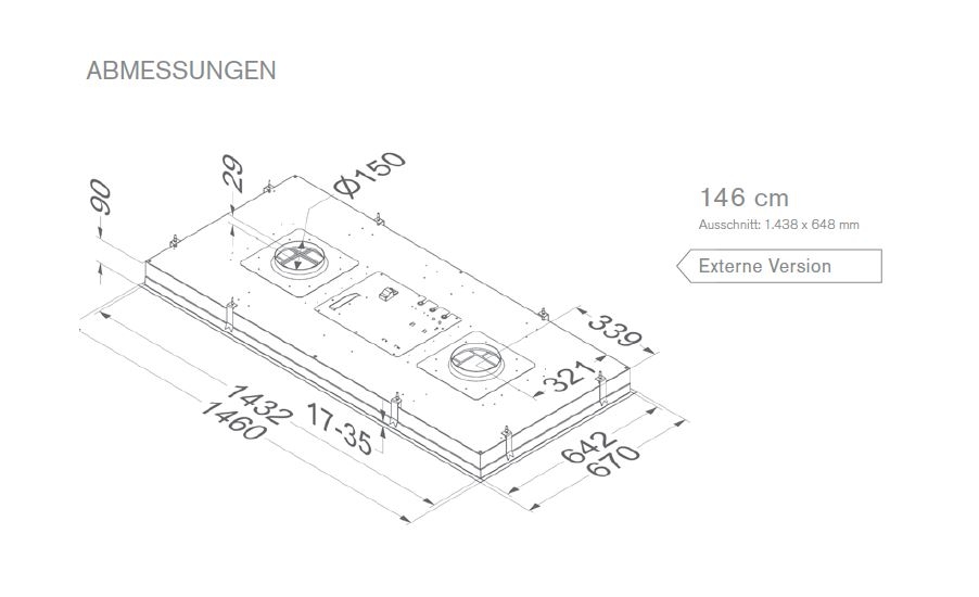 Bei partieller Abhängung empfehlen wir die Planung eines circa 5 cm hohen Wrasenfangraumes. Bei den Trockenbaumaßen muss das trichterförmige Aufsteigen des Kochdunstes mit circa 10