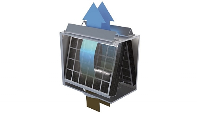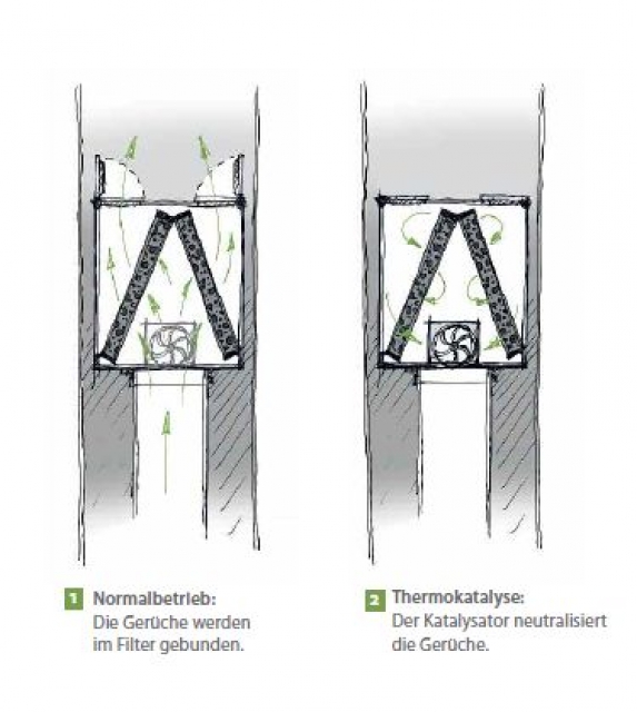 Im Normalbetrieb werden die Filtermatten durchströmt und nehmen die Geruchsstoffe auf. Die Geruchsbindung beträgt dabei 97 %.