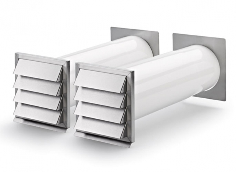 - Zweiteiliger Mauerkasten mit separaten Abluft- und Zuluftelementen. Die beiden Edelstahl-Designaußenjalousien in moderner Lamellenoptik mit innen liegenden Rückstauklappen lösen auch räumlich schwierige Einbausituationen. Eine Edelstahl-Innenabdeckung des Abluftelements lässt sich über das Kunststoffrohr schieben und verdeckt sauber den Wanddurchbruch. Auf der Zuluftseite befindet sich ein Gitterauslass mit einem Aufnahmestutzen für das Rundrohr. Beide Elemente können als Set direkt nebeneinander oder auch als Einzelelement verwendet werden. Optimale Strömungswerte durch volumenstromgesteuerte Ab- und Zuluftöffnungen. Die Zuluftklappe öffnet nur bei Unterdruck. Bei Einbau mit einem raumluftabhängigen Kamin, stimmen Sie sich bitte mit Ihrem zuständigen Schornsteinfeger ab.