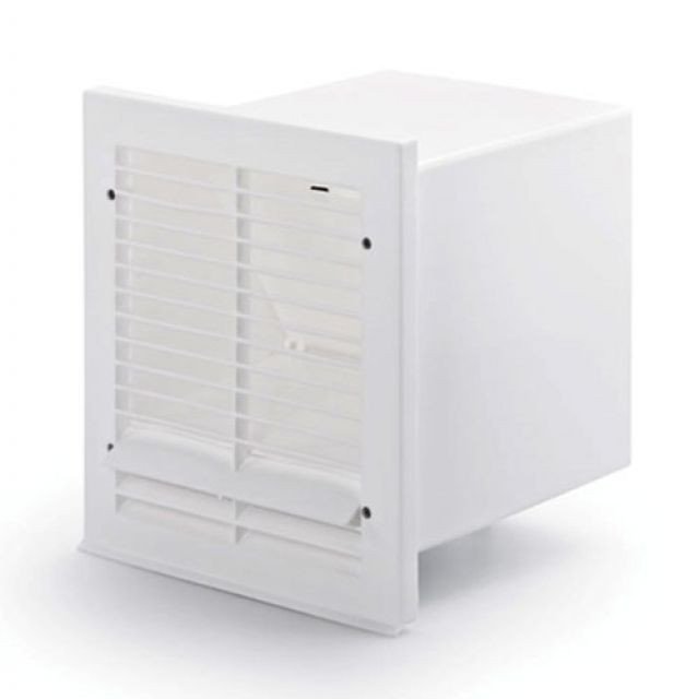 - Mauerkasten mit weißer Außenjalousie und Teleskoprohr, mit Rohranschluss 100, 120 und 125 mm