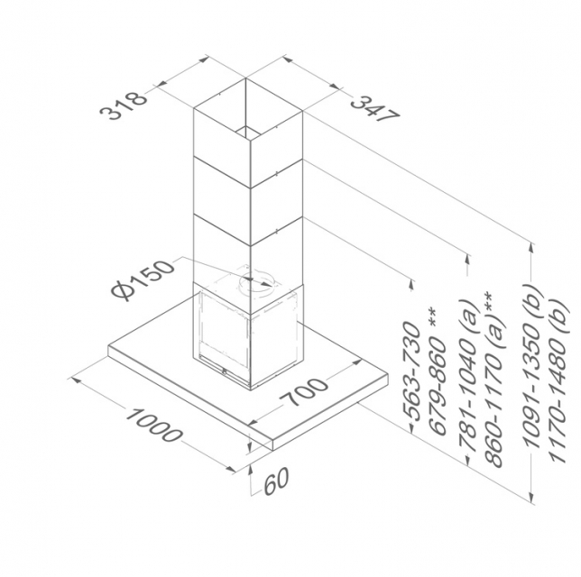 - Höhe (min. - max.) bei Abluft: 56.3 x 70 cm