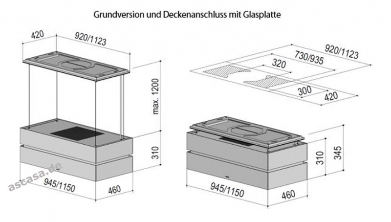 • Seillänge individuell verlängerbar für hohe Räume; Haube schwebt auf Höhe der Seilverlängerung unter der Decke.