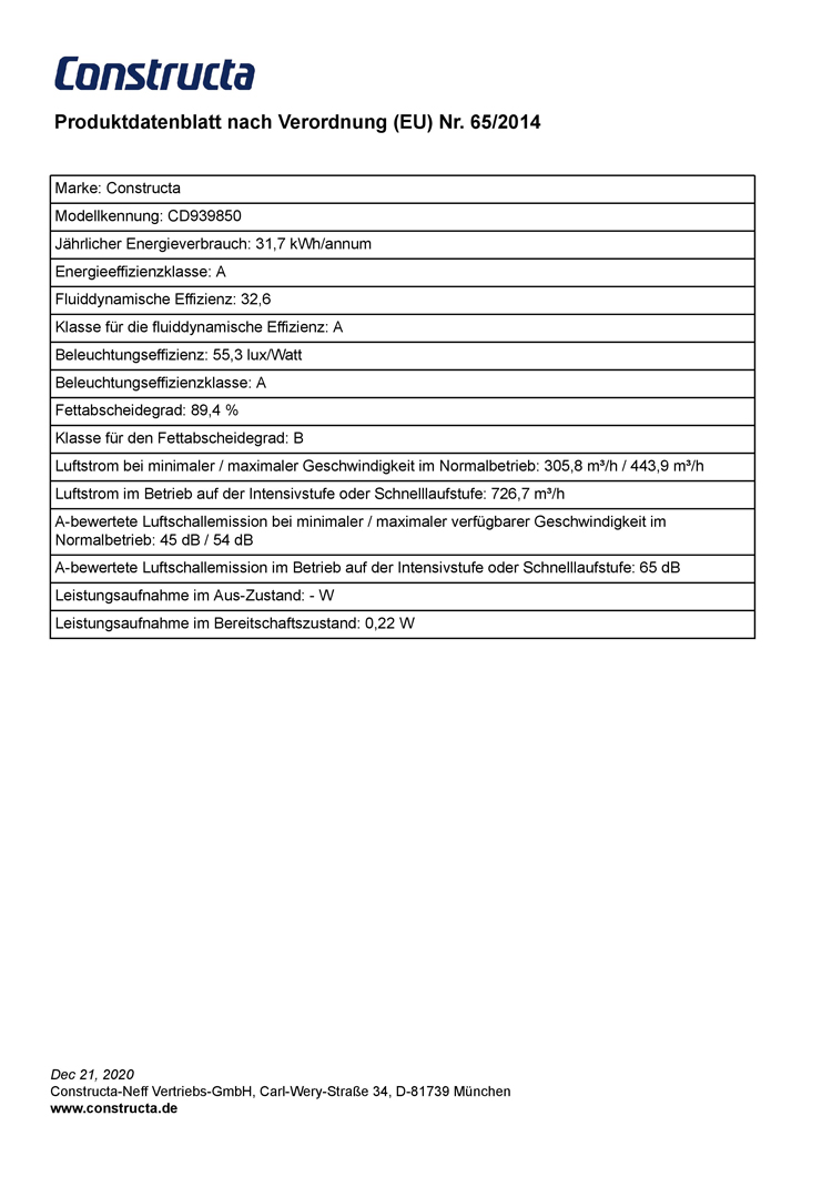 • Energieeffizienzklasse: A (auf einer Energieeffizienzklassen-Skala von A+++ bis D)