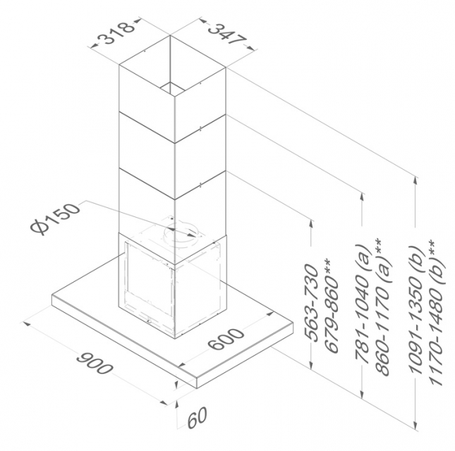- Höhe (min. - max.) bei Abluft: 56.3 x 70 cm