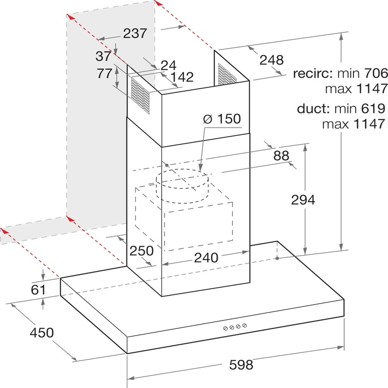 - Außenmaße (H x B x T): 1147 x 598 x 450 mm