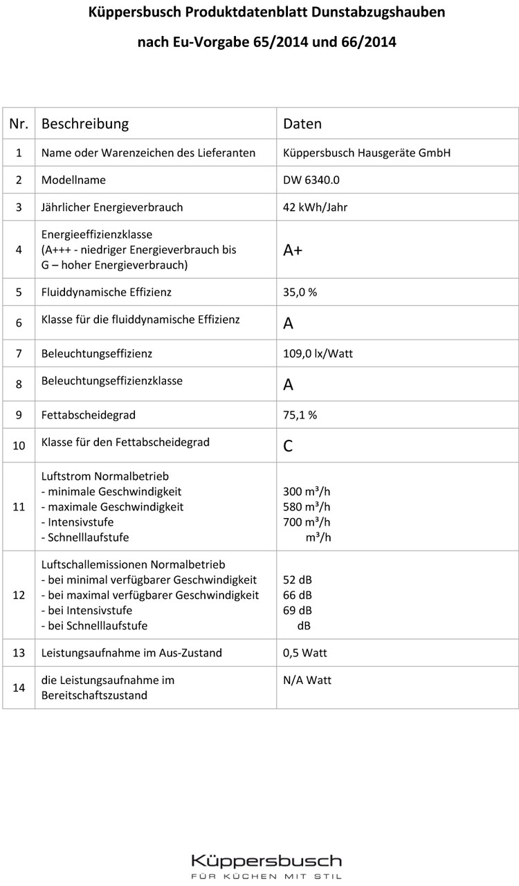 • Gebläseleistung im Abluftbetrieb nach Richtlinie 2010/30/EU: max. Normalstufe 580 m³/h, Intensivstufe 700 m³/h