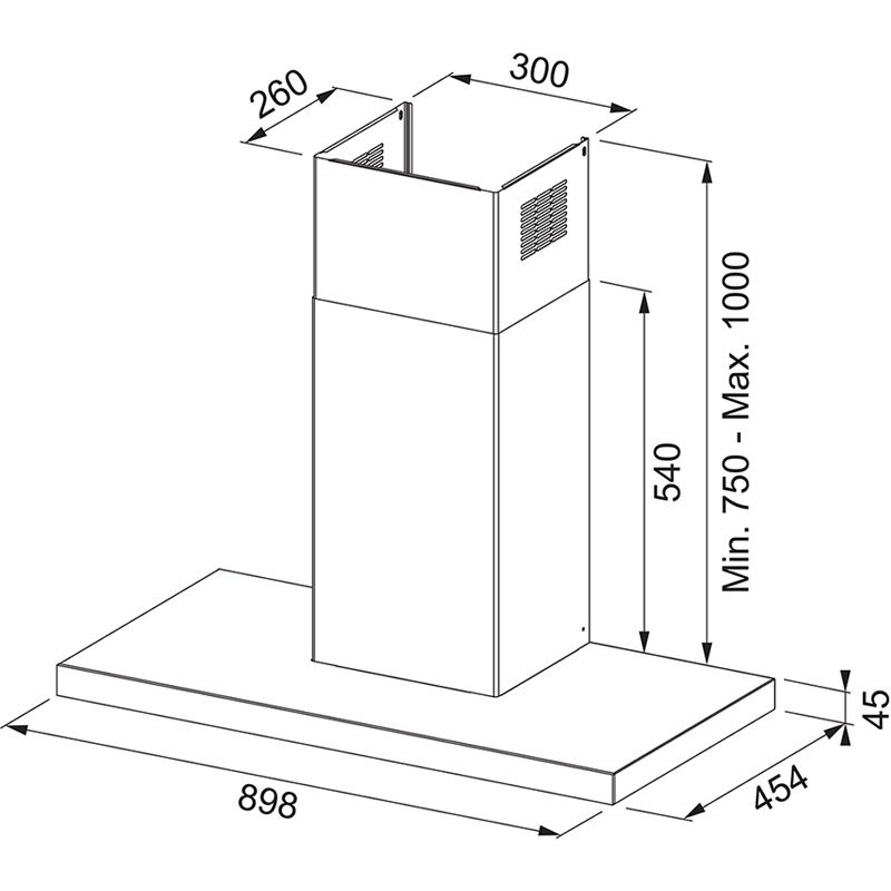 - Sicherheitsabstand zwischen Unterkante Haube und Induktions-Kochfeld: 50 cm, Gaskochfeld : 65 cm