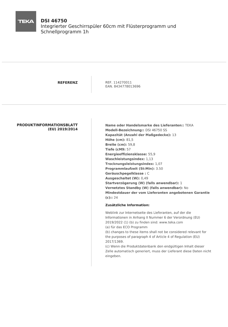 Teka DSI 46750, Geschirrspüler integrierbar, 60 cm