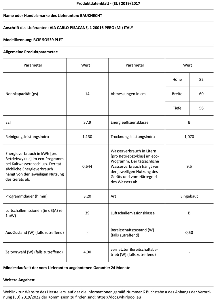 - 9,5 Liter Wasser, 0,644 kWh Strom im eco-Programm pro Betriebszyklus