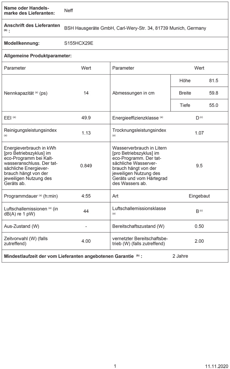 Neff S155HCX29E N50, Geschirrspüler vollintegrierbar, 60 cm, EEK: D, mit 5 Jahren Garantie!products_warranty_conditions