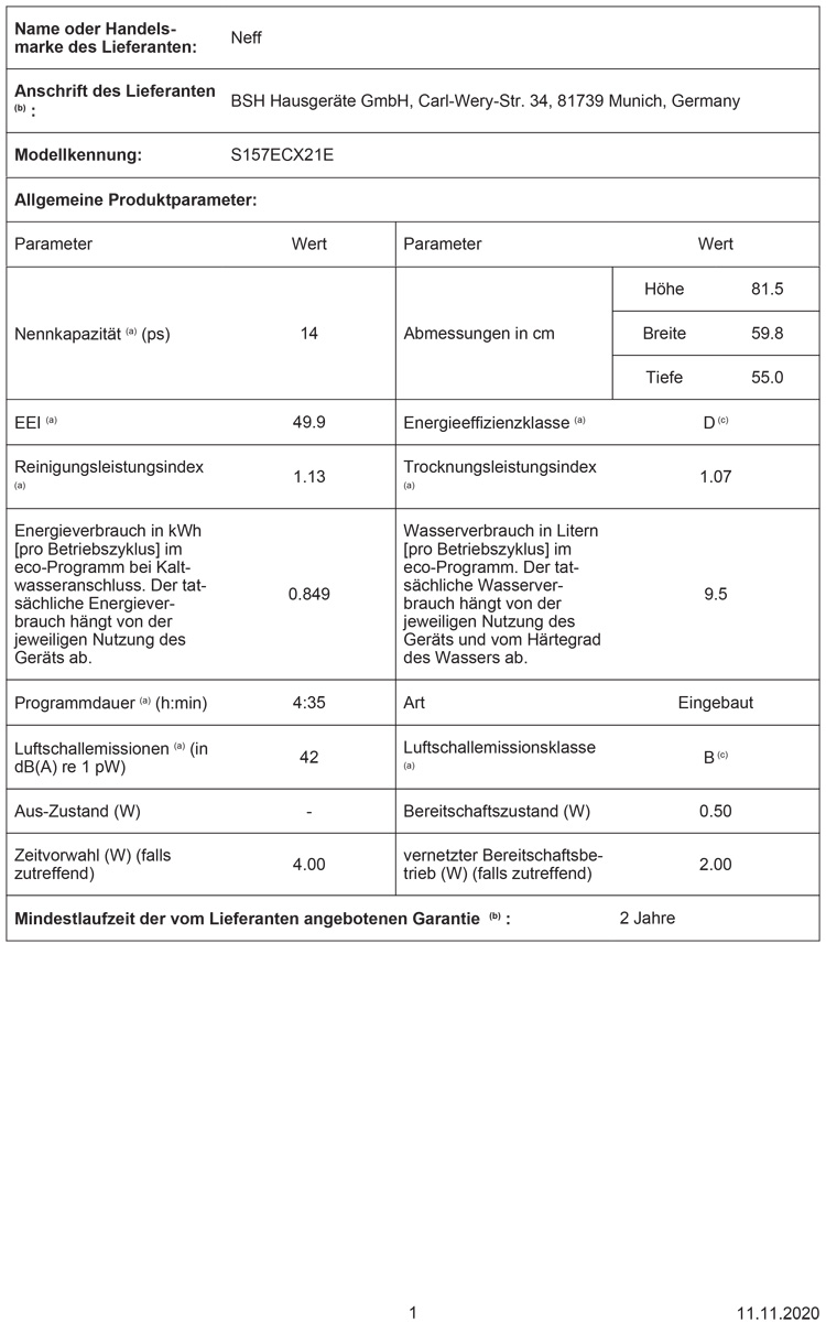 Neff S157ECX21E N70, Geschirrspüler vollintegrierbar, 60 cm, EEK: D, mit 5 Jahren Garantie!products_warranty_conditions