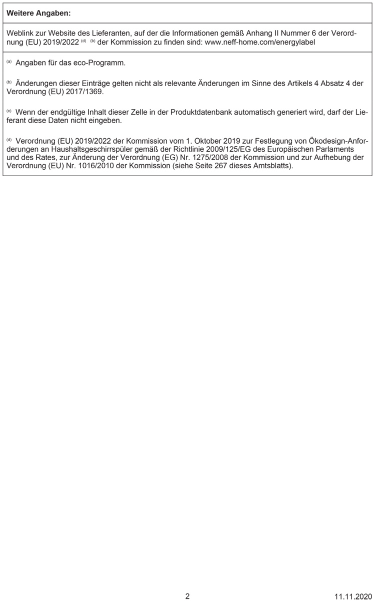 • Energieverbrauch 74 kWh/Jahr auf der Grundlage von 100 Standardreinigungszyklen bei Kaltwasserbefüllung und dem Verbrauch der Betriebsarten mit geringer Leistungsaufnahme. Der tatsächliche Energieverbrauch hängt von der Art der Nutzung des Geräts ab
