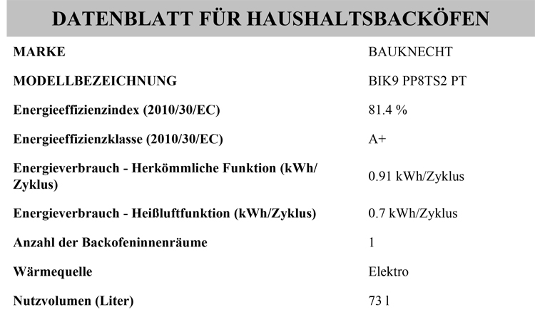 - Energieverbrauch nach DIN 0.7 kWh Umluft