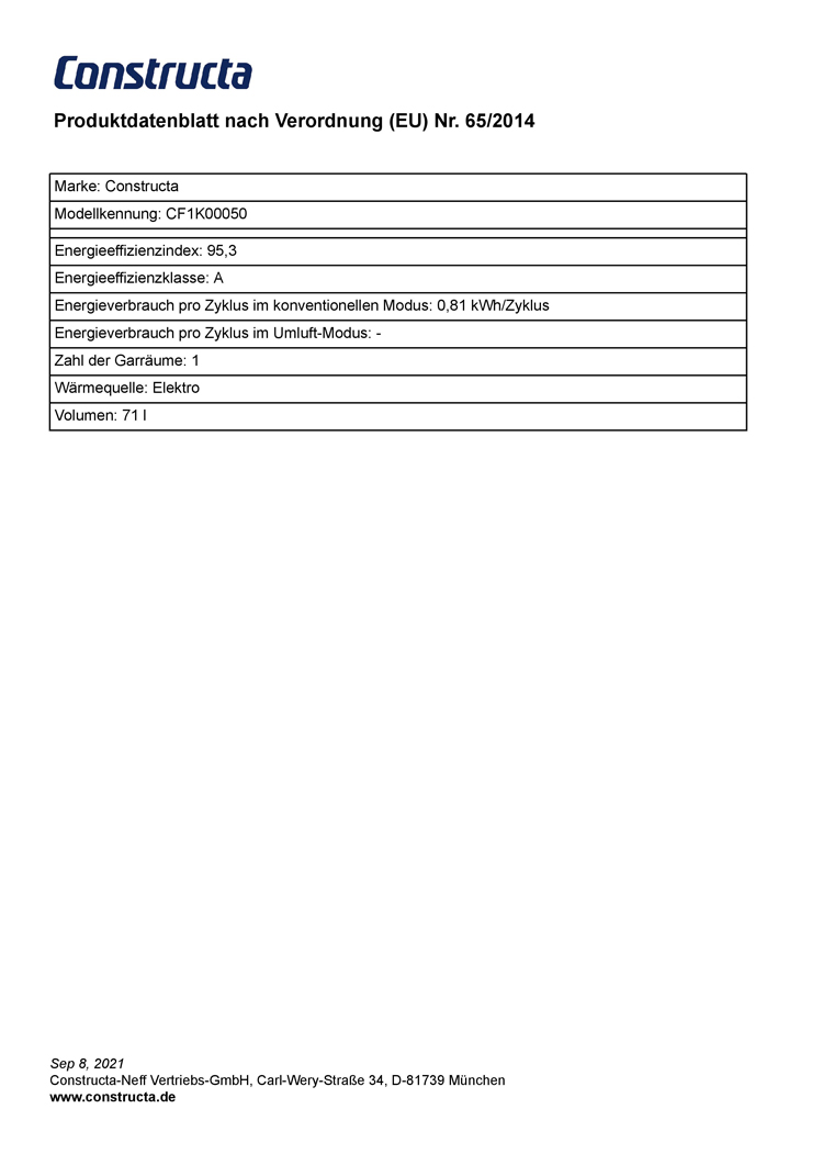 Der Constructa CF1K00050 verfügt u.a. über 5 Beheizungsarten, Halogen-Innenbeleuchtung und über eine Vollglas-Innentür.