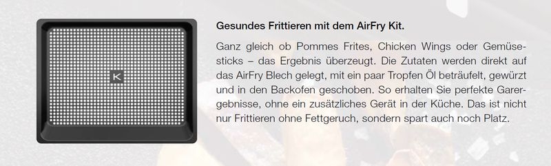 Ganz gleich ob Pommes Frites, Chicken Wings oder Gemüsesticks – das Ergebnis überzeugt. Die Zutaten werden direkt auf das AirFry Blech gelegt, mit ein paar Tropfen Öl beträufelt, gewürzt und in den Backofen geschoben. So erhalten Sie perfekte Garergebnisse, ohne ein zusätzliches Gerät in der Küche. Das ist nicht nur Frittieren ohne Fettgeruch, sondern spart auch noch Platz.