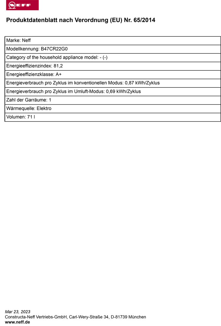 • Energieeffizienzklasse (gem. EU Nr. 65/2014): A+