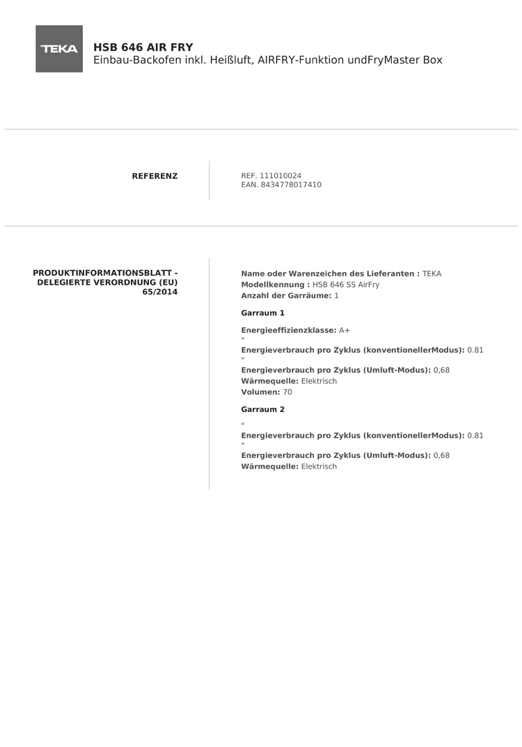 - Reparatur des Artikels Teka HSB 646 AIR FRY, Einbau-Backofen inkl. Heißluft, AIRFRY-Funktion und FryMaster Box oder
