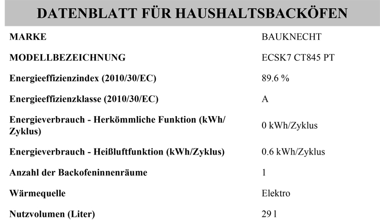 - Energieverbrauch nach DIN 0.6 kWh Umluft