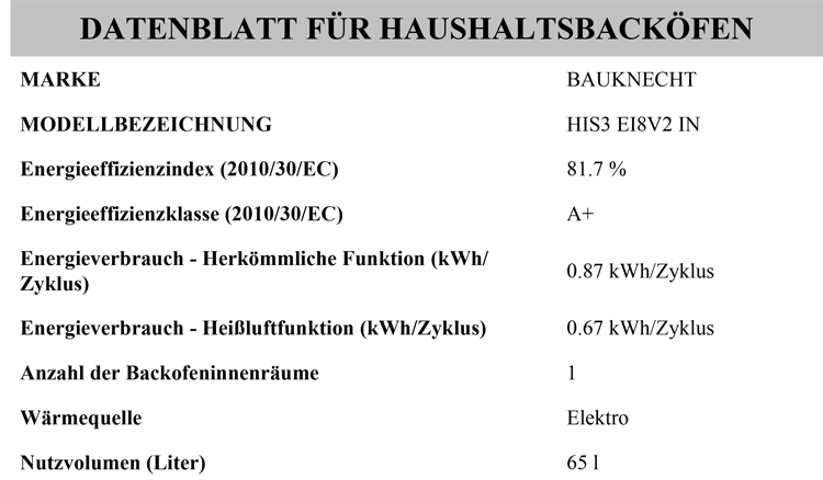 - Energieverbrauch nach DIN 0.67 kWh Umluft