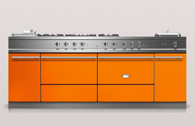 Lacanche Sully 2200 Modern, Rangecooker, Farbe Mandarine, 220,5 cm, individuelle Gestaltung von Kochfeldern, Gasbrennern, Backofen und Ausführung der Beschläge, mit 5 Jahren Garantie!