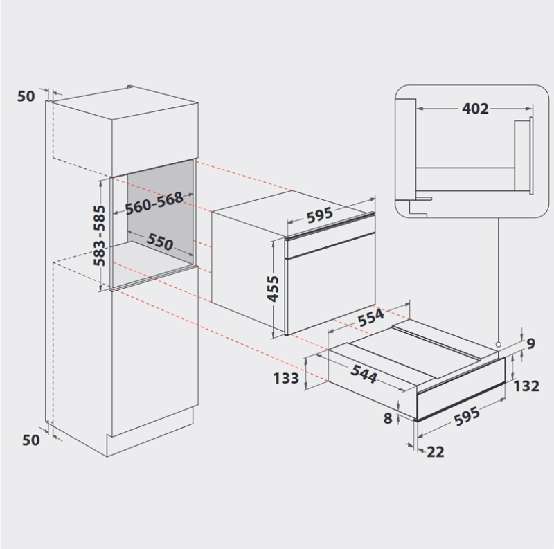 - Nischenmaße (hxBxT): 134.5x560x550 mm